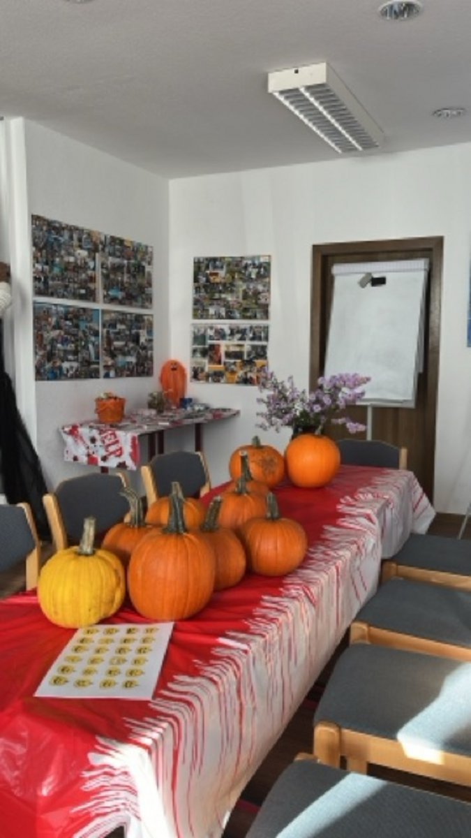 Die Räumlichkeiten in der Kirchstraße waren eindrucksvoll mit Dekorationsartikeln, die bereits zuvor in gemeinsamer Arbeit mit den Migranten gefertigt worden waren, und auch mit gespendeten Kürbissen geschmückt. Dadurch herrschte in dem Café eine „schaurig-schöne“ Stimmung.
