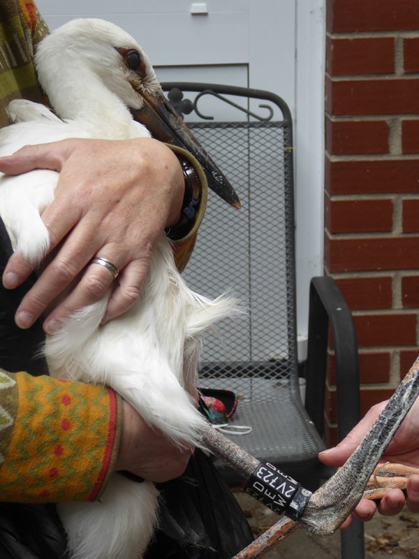 Da unser unser „Kleiner“ 56 Tage alt ist, wurde unter Anleitung von Bärbel Rogoschik (Leiterin des Artenschutzzentrum) und in meinem Beisein von Ingrid Schröter der Ring angelegt. Wenn in der Zukunft jemand diesen Ring abliest und es der Vogelwarte meldet, bekommen wir auch die Nachricht und erfahren so viel von unserem Winsener Storch.