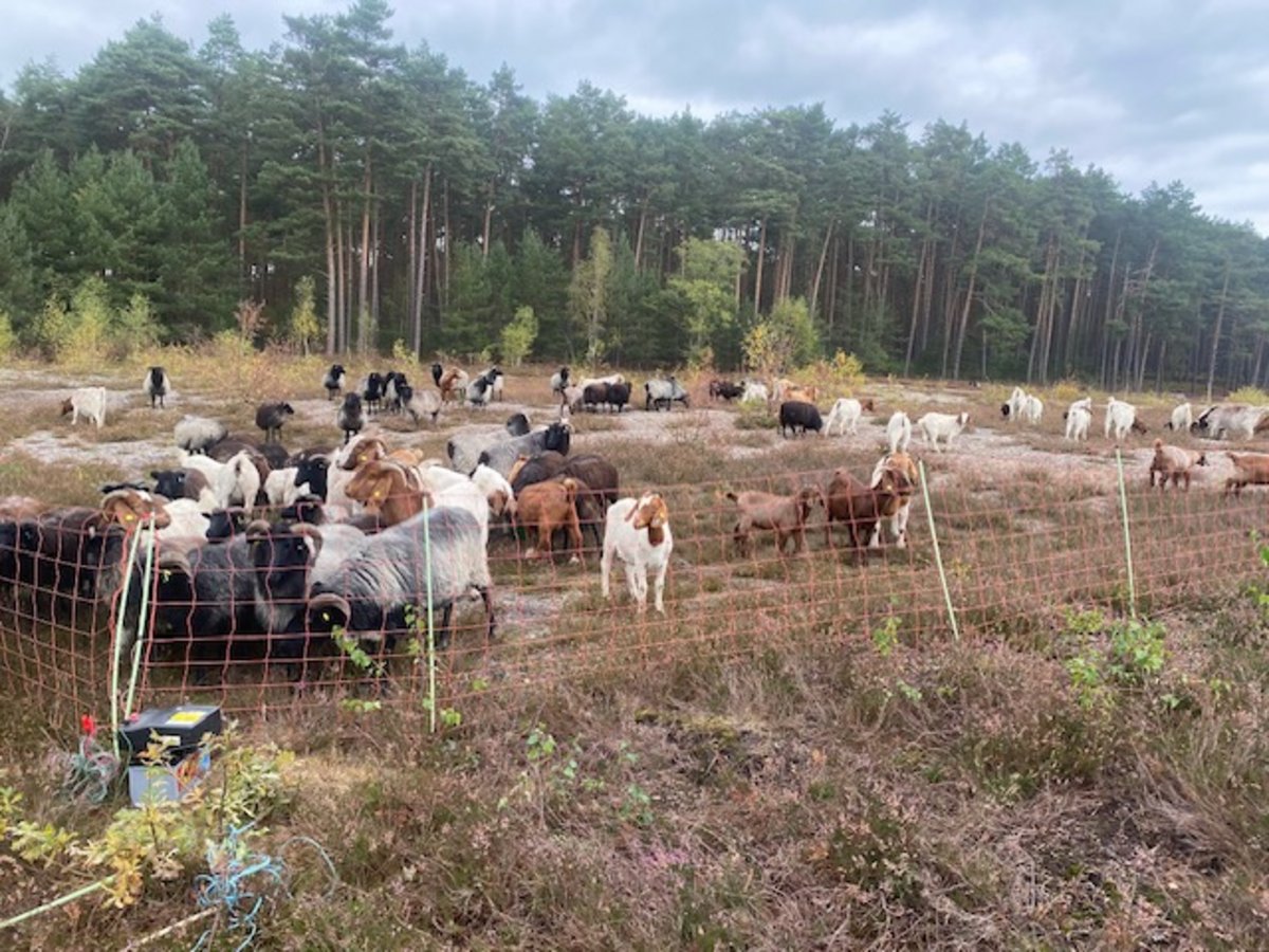 Große Ziegen- und Heidschnuckenherde hinter einem Elektrozaun auf einer Heidefläche vor einem Kiefernwald.